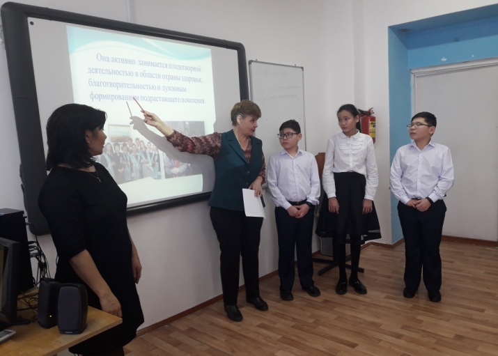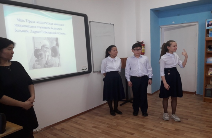 Осы күні өзін-өзі тану пәнінің мұғалімі Н.Тарасенкова 5-8 орыс кластарының оқушыларымен бірге "Жизнь посвящённая людям" атты танымдық сағатын өткізді.