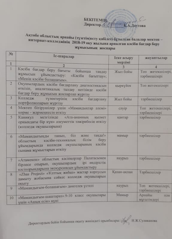 Осы міндеттерді жүзеге асыру мақсатында жоспар құрылып, педагогтар мамандыққа бейімдеу бағытында іс-шаралар жүргізуде.