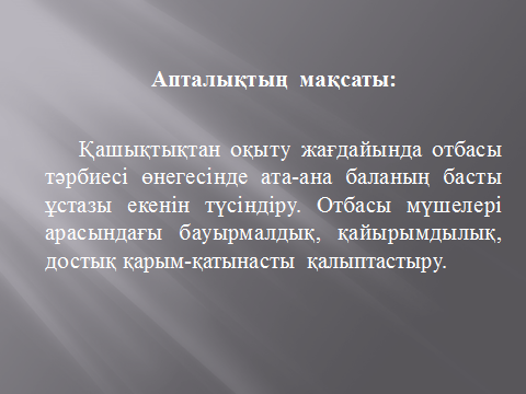 Мақсаты: Қашықтықтан оқытудағы мүмкіндігі шектеулі балаларды оқыту-дағы отбасы тәрбиесі ,өнегесі және ата-ана баланың бас ұстазы екенін түсін-діру. Отбасы арасындағы бауырмалдық, достық қарым-қатынасты қалыптастыру.
