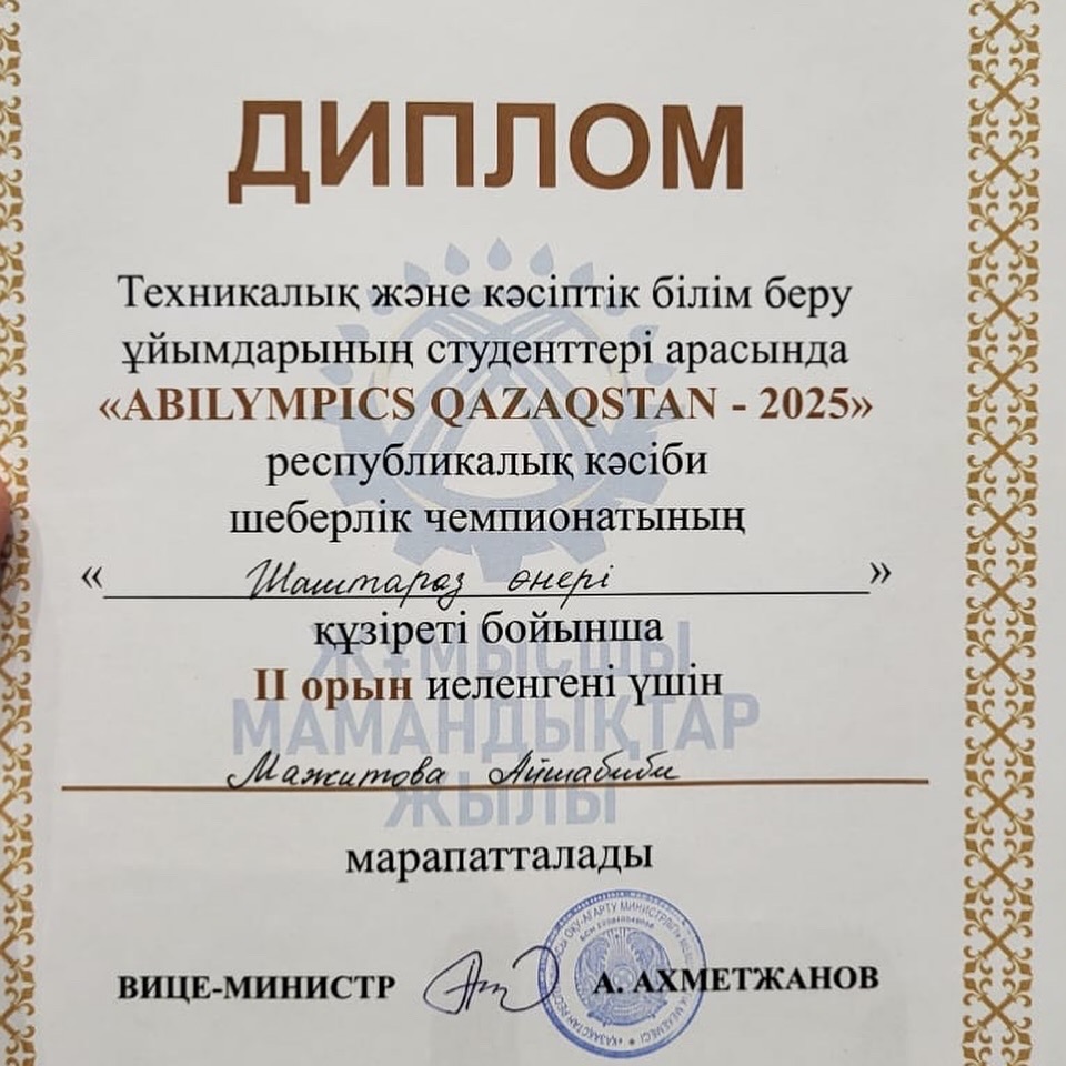 Республикалық кәсіби шеберлік чемпионатында Мажитова Айшабибі 2-орынға ие болды.