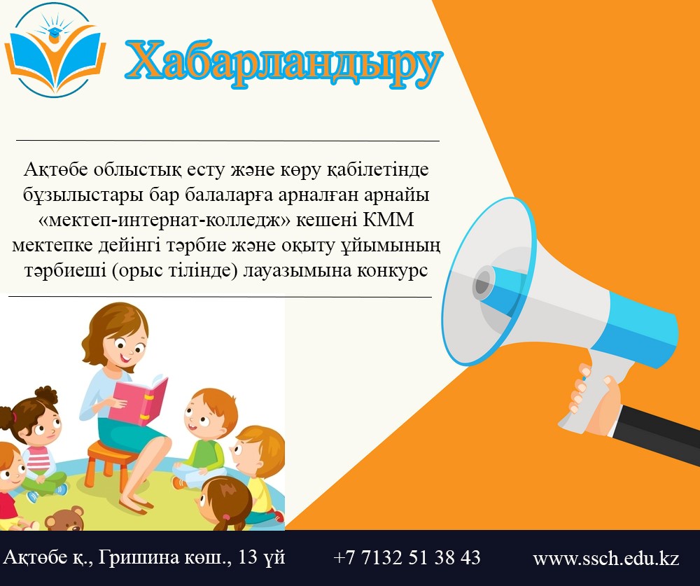 Ақтөбе облыстық есту және көру қабілетінде бұзылыстары бар балаларға арналған арнайы «мектеп-интернат-колледж» кешені КММ мектепке дейінгі тәрбие және оқыту ұйымының тәрбиеші (1 бос орын орыс тілінде ) лауазымына конкурс жариялайды